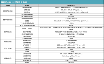 商品名稱:耳目達全向麥克風A201.全向8麥陣列,5米全雙工 2.AI降噪,在純凈語音中提升效率 3.支持級聯,大中小會議室無憂通話 4.埋線式免驅設計,實現便捷會議 5.8單元全向MEMS麥克風 5米拾音半徑 高保真揚聲器 AI降噪/回聲消除/混響抑制 全雙工通話 最多支持5臺級聯 人性化埋線設計 USB即插即用 兼容主流會議軟件