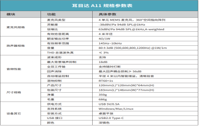 耳目達全向麥克風A201.全向8麥陣列,5米全雙工 2.AI降噪,在純凈語音中提升效率 3.支持級聯,大中小會議室無憂通話 4.埋線式免驅設計,實現便捷會議 5.8單元全向MEMS麥克風 5米拾音半徑 高保真揚聲器 AI降噪/回聲消除/混響抑制 全雙工通話 最多支持5臺級聯 人性化埋線設計 USB即插即用 兼容主流會議軟件